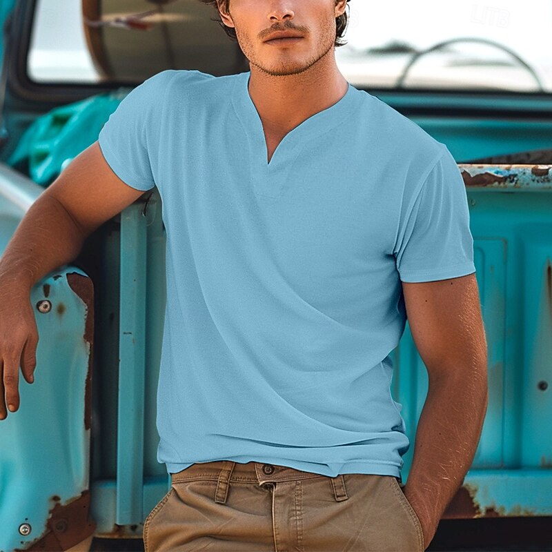 : The classic V-neck design adds a modern and sleek touch to the t-shirt, providing a versatile option for both sporty and casual occasions. The short sleeves enhance its relaxed and comfortable vibe, while the plain color palette offers easy pairing with other clothing items.