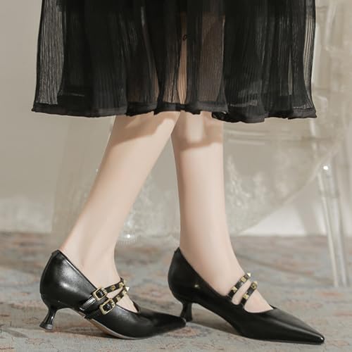 Women's Closed Pointed Toe Low Heel Mary Jane Pumps Fashion Studded Ankle Strap Kitten Heel Formal Heels Wedding Prom Business Dress Shoes 5