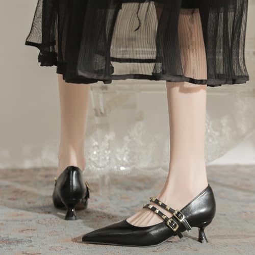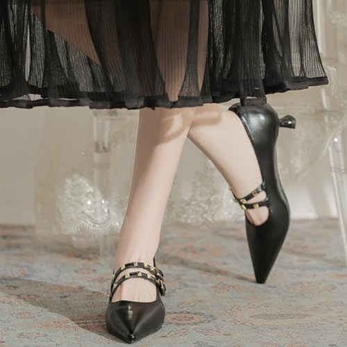 Women's Closed Pointed Toe Low Heel Mary Jane Pumps Fashion Studded Ankle Strap Kitten Heel Formal Heels Wedding Prom Business Dress Shoes 6