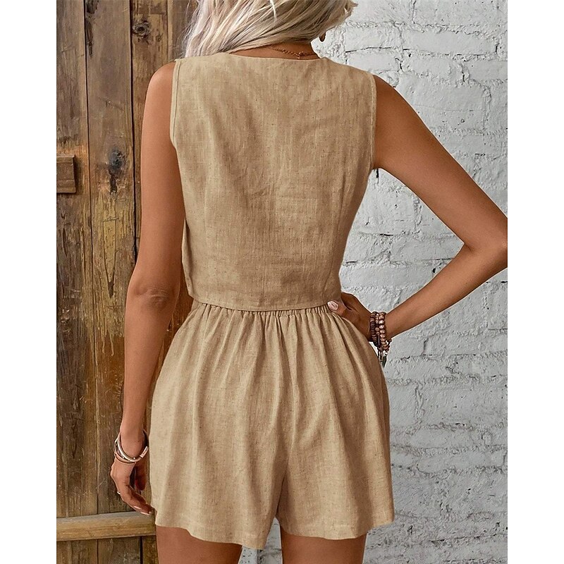 HOT ! Women's Fashion Streetwear Cotton Linen Sets Shorts Sets Sleeveless V Neck Plain Daily Wear Date Wine Dark Navy Khaki Summer Regular Fit