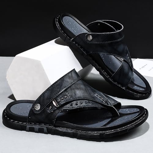 Men's Leather Sandals with Adjustable Strap Black Slip-On Beach Sandals Thong Open Toe Arch Support Non-Slip Soft Comfortable Slide Sandals 5
