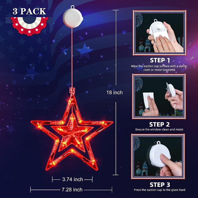 More information about 3 Pcs July 4th Patriotic Hanging Lights Independence Day Red, White, Blue Pentagram Suction Cup Window Decorative Lights Party Patriotic Atmosphere Decorative Lights AAA Battery Box