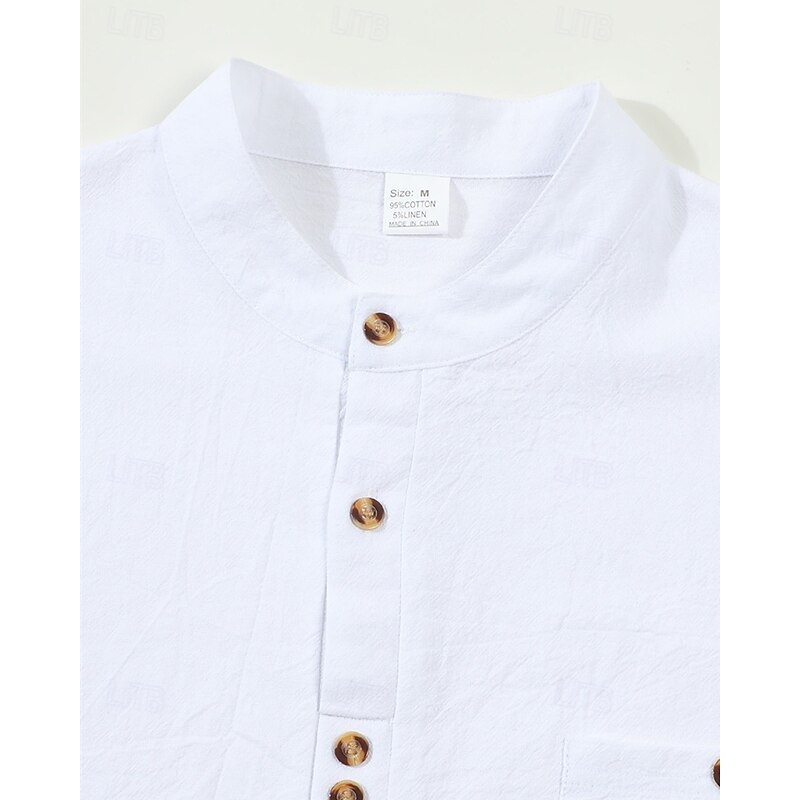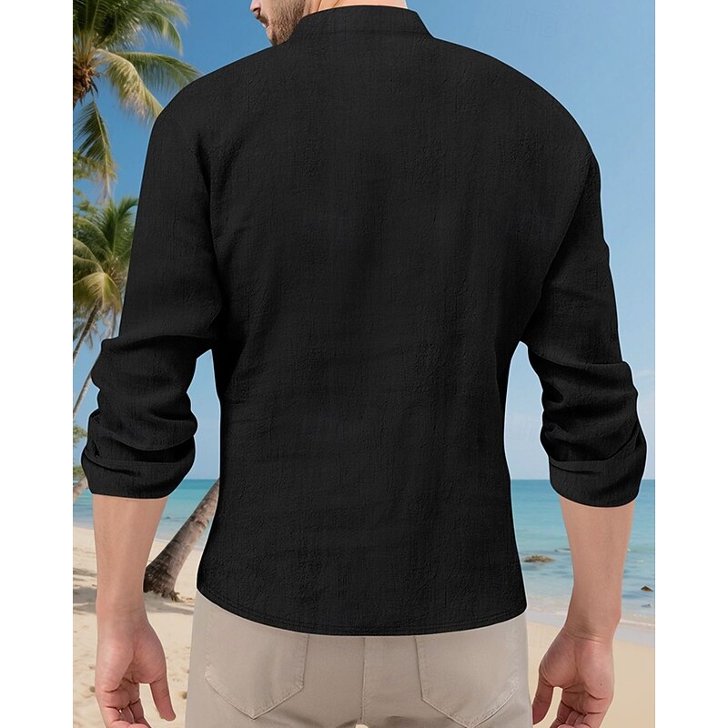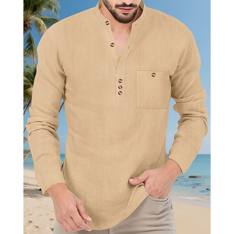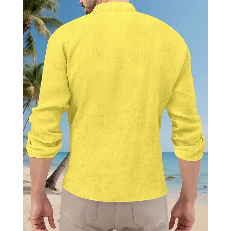 HOT ! Men's Shirt Popover Shirt Summer Shirt Casual Shirt Beach Shirt Black White Yellow Navy Blue Sky Blue Long Sleeve Plain Band Collar Vacation Hawaiian Front Pocket Clothing Apparel Linen Fashion