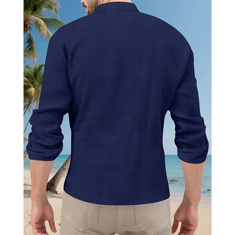Men's Shirt Popover Shirt Summer Shirt Casual Shirt Beach Shirt Black White Yellow Navy Blue Sky Blue Long Sleeve Plain Band Collar Vacation Hawaiian Front Pocket Clothing Apparel Linen Fashion 7
