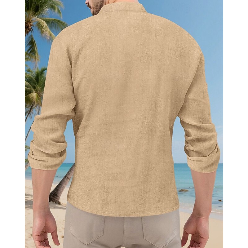 Men's Shirt Popover Shirt Summer Shirt Casual Shirt Beach Shirt Black White Yellow Navy Blue Sky Blue Long Sleeve Plain Band Collar Vacation Hawaiian Front Pocket Clothing Apparel Linen Fashion 17