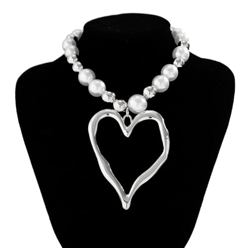 HOT ! Y2k Chunky Heart Necklaces for Women Silver Large Heart Pendant Pearl Beaded Necklace Love Statement Choker Necklace Heart Jewelry Accessories Gift