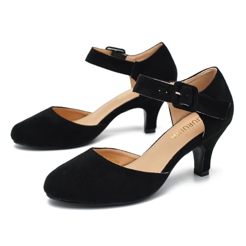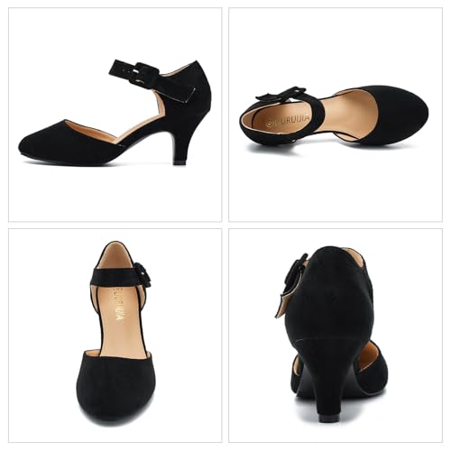 • Comfort and Practicality: women's black pumps ankle strap heels designed as low heel dress shoes for women, 2 inch heels (approx 2.36"/6CM) for timeless elegance, the kitten heels provide a perfect balance of height and comfort. The retro heels feature a breathable lining and a secure buckle strap, ensuring all-day wearability.