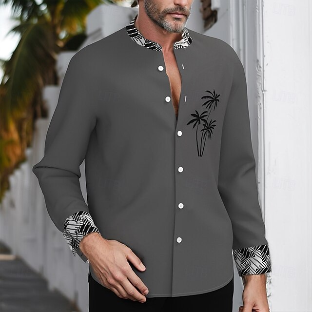 More information about Men's Coconut Tree Tropical Plants Shirt Summer Hawaiian Shirt Collarless Shirt Long Sleeve Hawaiian Resort Vacation Casual Holiday Summer Spring Standing Collar 3D Print Button Down Shirts Dark Green