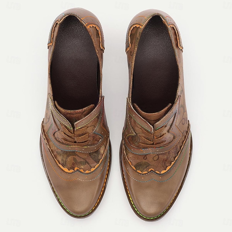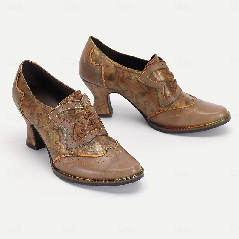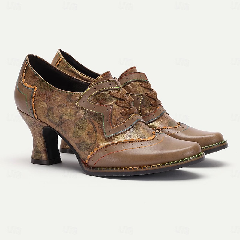 Highlights [Fabric] : Crafted from premium 100% cowhide leather, these women's pumps guarantee exceptional durability and comfort. The high-quality leather upper ensures a luxurious look and feel, perfect for prolonged wear during any occasion. [Fit] : These shoes are designed with a moderate kitten heel, providing just the right amount of elevation while maintaining stability and comfort. The round toe design adds comfort, allowing for extended wear without compromising on style. [Design Highlights] : The shoes boast an intricate floral pattern and multi-colored decorative stitching, which beautifully enhance the classic vintage brogue style. The lace-up closure not only provides a secure fit but also adds an elegant touch to the overall design. [Occasions] : Ideal for weddings, parties, and various special occasions, these heels effortlessly combine traditional craftsmanship with contemporary elegance. Whether for a festive event or a casual day out, they are a versatile addition that complements any wardrobe with a vintage flair. [Size Notice] : Available in a range of sizes from US6 / EU36 / UK4 to US12 / EU42 / UK10, these shoes cater to a variety of foot sizes, ensuring a perfect fit for everyone seeking both style and comfort.