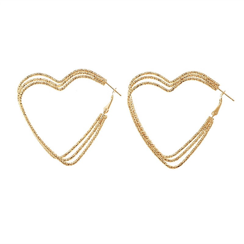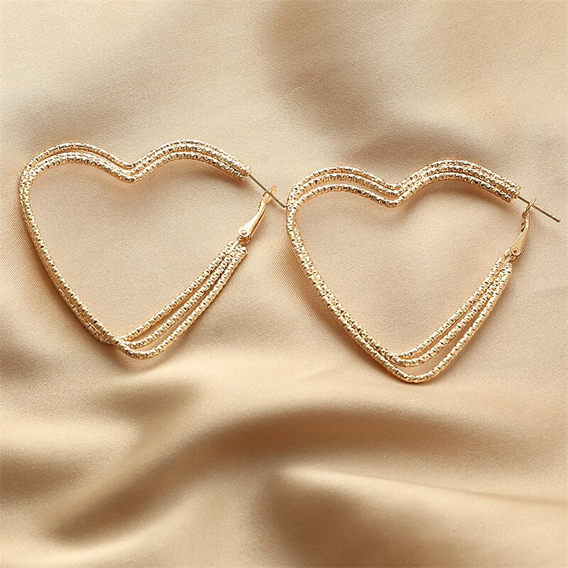 Highlights [Fabric and Material] : These elegant heart-shaped hoop earrings are crafted from high-quality gold-tone metal alloy, offering both durability and a lightweight feel for comfortable all-day wear. The textured surface design enhances their sparkling appearance, catching light from every angle. [Design and Fit] : Featuring a chic and modern silhouette with a bold geometric heart design, these earrings make a stunning statement piece. The large hoops are designed to be both eye-catching and sophisticated, blending modern style with classic charm. [Design Highlights] : The textured gold-tone finish gives these earrings an extra touch of shine and elegance. The sleek heart-shaped design adds a romantic and timeless appeal, suitable for any fashion-forward look. [Occasions] : Perfect for party evening wear, Valentine's Day, birthdays, festivals, and office settings, these earrings seamlessly transition from casual to formal occasions. Their chic and modern style adds a touch of elegance to any outfit, making them versatile for daily wear, dates, and work events. [Size Notice] : The earrings are one-size, designed to fit comfortably and complement a variety of earring styles. Crafted with attention to detail, they are the ideal accessory for adults seeking to enhance their fashion statement.