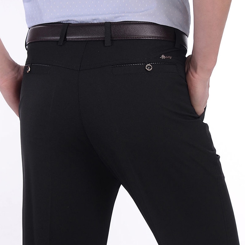 Highlights [Fabric] These men's dress trousers are crafted from a high-quality blend of spandex, polyester, and ice silk, providing a soft and comfortable feel. The fabric is stretchy, ensuring ease of movement and a breathable experience suitable for all seasons—spring, fall, winter, and summer. [Fit] Featuring a classic fit with a high-waisted design, these trousers are tailored to highlight a sleek and elegant silhouette. The structured waistband with belt loops offers a perfect fit, allowing for versatility in styling. [Design Highlights] The trousers boast a classic design with a full-length cut and a zipper fly. The inclusion of a back pocket with a button detail adds a touch of practicality and sophistication, making them a standout choice for the modern man. [Occasions] Ideal for formal events, weddings, or business settings, these trousers seamlessly combine elegance with practicality. Their timeless style makes them versatile enough for both professional and special occasions. [Size] Available in a range of sizes from 31 to 40, these trousers are designed to accommodate a variety of fits, ensuring comfort and style for different body types. The classic black, navy blue, and light grey color options offer excellent versatility for any wardrobe.
