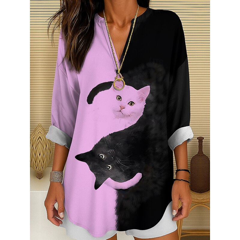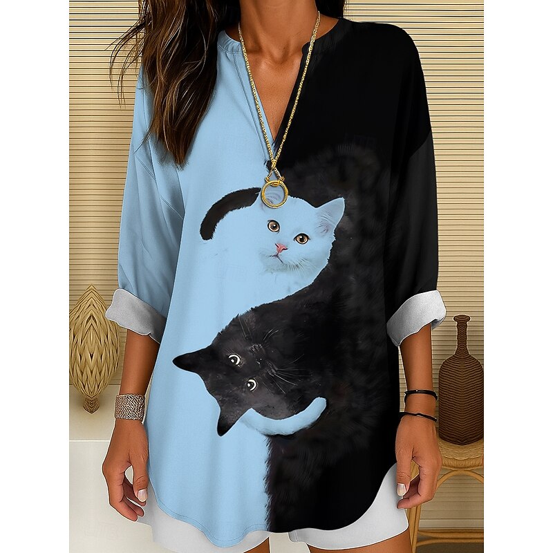 Women's Blouse Tunic V Neck Long Sleeve Boho Casual Summer Tops Graphic Animal Cat Vintage Tropical Regular Tops Daily Wear Print Black And White Yellow Pink Red Blue 11