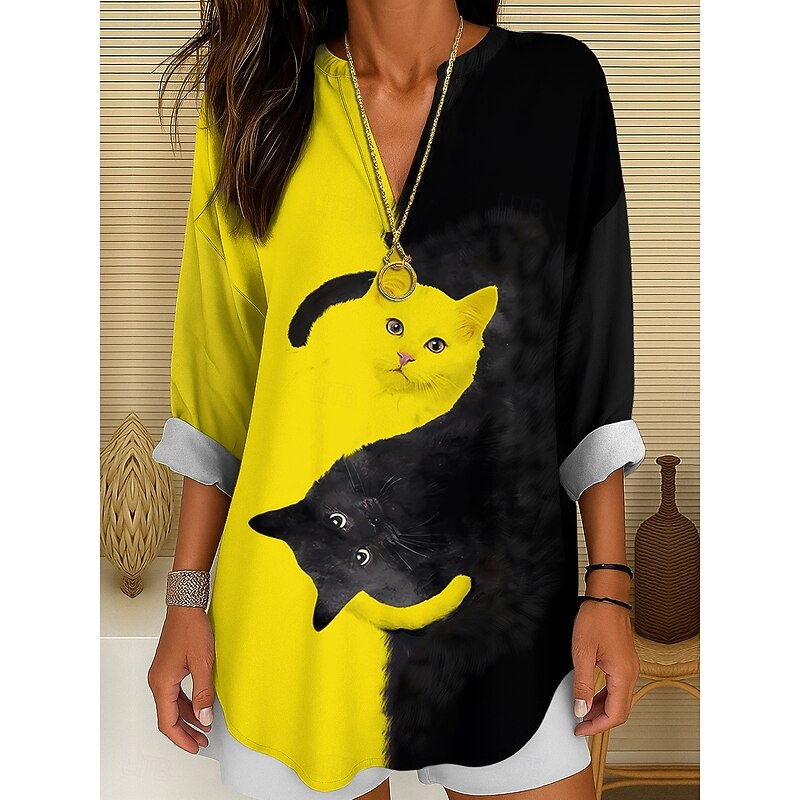 HOT ! Women's Blouse Tunic V Neck Long Sleeve Boho Casual Summer Tops Graphic Animal Cat Vintage Tropical Regular Tops Daily Wear Print Black And White Yellow Pink Red Blue