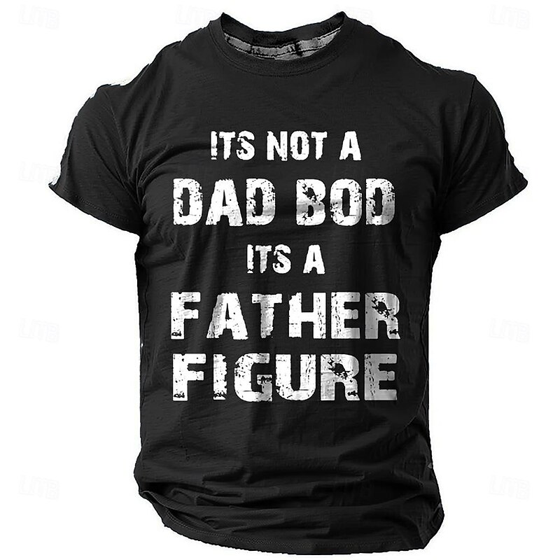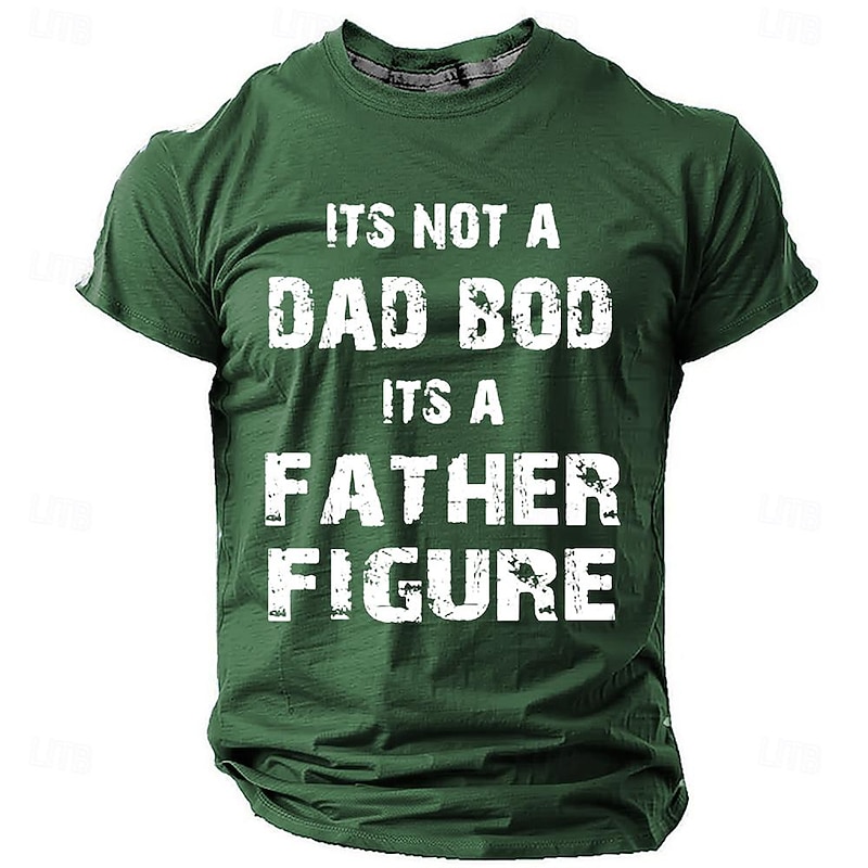 : Featuring a bold graphic print with the humorous statement "It's Not A Dad Bod, It's A Father Figure" on the front, this t-shirt showcases a playful, vintage-inspired vibe. The distressed font adds a trendy touch, while the classic crew neck and short sleeves complement its casual aesthetic.