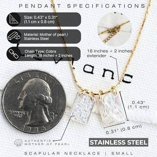 Protection Necklace – This Catholic scapular features mother of pearl and stainless steel with images of the Sacred Heart of Jesus and Virgin of Carmen (Escapulario de la virgen del carmen / Scapular of Our Lady of Mount Carmel). Combining faith and protection, it's a meaningful necklace for special occasions and moments of reflection. Sacred Heart Necklace.Authentic Mother of Pearl – Scapular pendants measuring 0.31 inches (0.8 cm) x 0.43 inches (1.1 cm) with a 2mm thickness. The Cobra chain is 18 inches + 2 inch extender is nickel and lead-free, hypoallergenic, and crafted from high-quality stainless steel.Catholic necklace for women – Handmade With Care ✦ 100% Satisfaction. Your happiness is our top priority. Each scapulars catholic necklace is Made with Love and Dedication. This Catholic necklace meets the highest quality standards.Christian Gifts for Women – Elegant christian necklace for women. Ideal for mom, daughter, wife, sister, aunt, niece, best friend, girlfriend, or yourself. Sacred heart necklace. (Escapularios catolicos)Gift Box Included – Our Scapular necklace comes in an elegant gift box. outstanding for treating yourself or a loved one on any occasion: anniversary, birthday, wedding, graduation, Christmas, Mother’s Day, Valentine’s Day or any special event. Perfect for everyday use. top-grade materials and excellent craftsmanship ensure long-lasting durability.