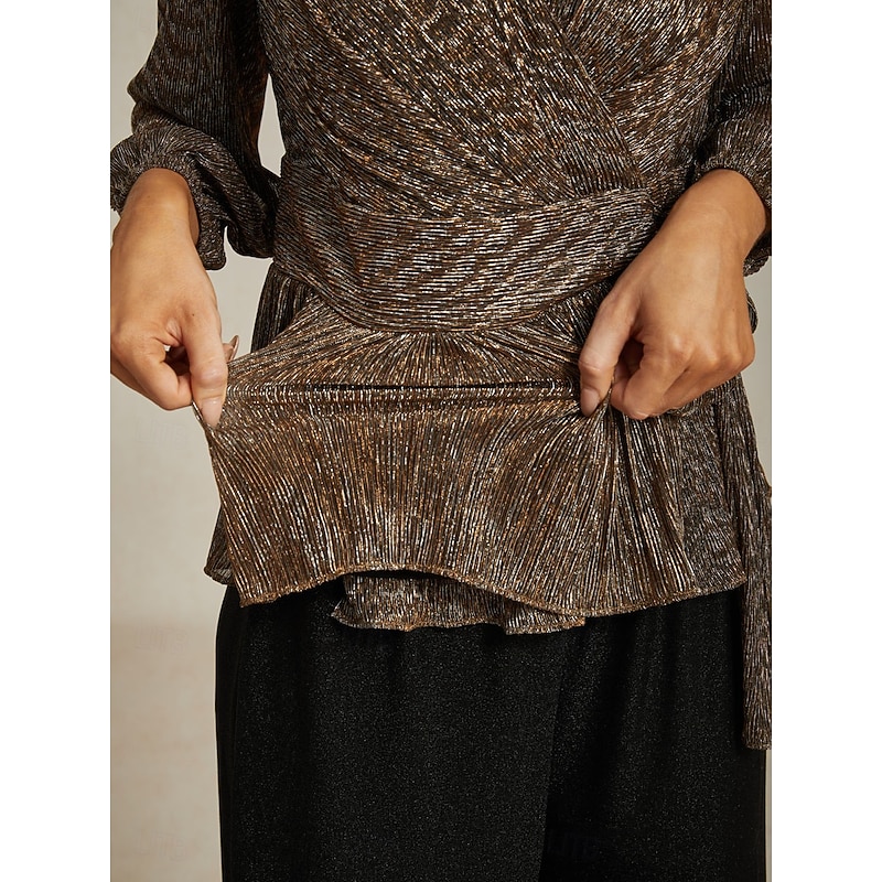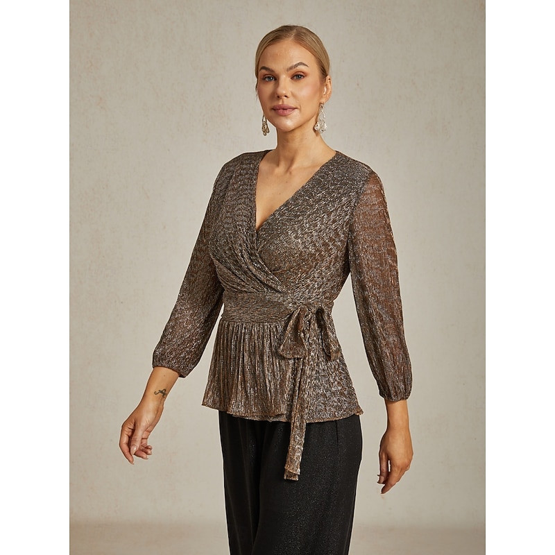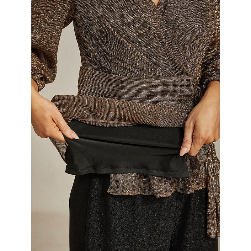 More information about Women's Wrap Tops Sheer Blouse Dressy Tops Elegant Party Stylish Long Sleeve Lantern Sleeve V Neck Regular Tops Wedding Guest Party Evening Wear Semi Formal Pleated Metallic Brown Fall Winter