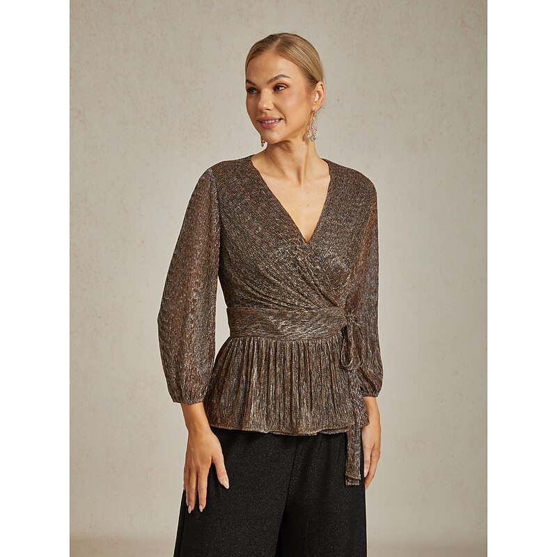 HOT ! Women's Wrap Tops Sheer Blouse Dressy Tops Elegant Party Stylish Long Sleeve Lantern Sleeve V Neck Regular Tops Wedding Guest Party Evening Wear Semi Formal Pleated Metallic Brown Fall Winter