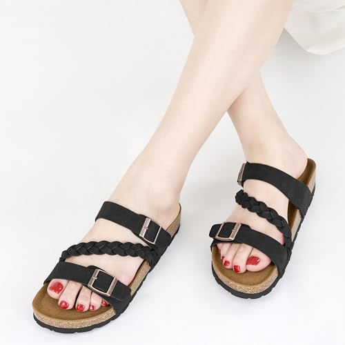 HARENCE Womens Flat Slides Sandals: Comfort Cork Footbed Slip On Slide Shoes Adjustable Buckle Open Toe Summer Outdoor Beach Sandal 5