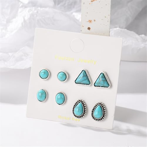 HOT ! Dreuyet Turquoise Stud Earrings Set for Women Handmade Gemstone Oval Round Flower Cut Shape Square Studs Earrings Boho Turquoise Earrings Trendy Jewelry