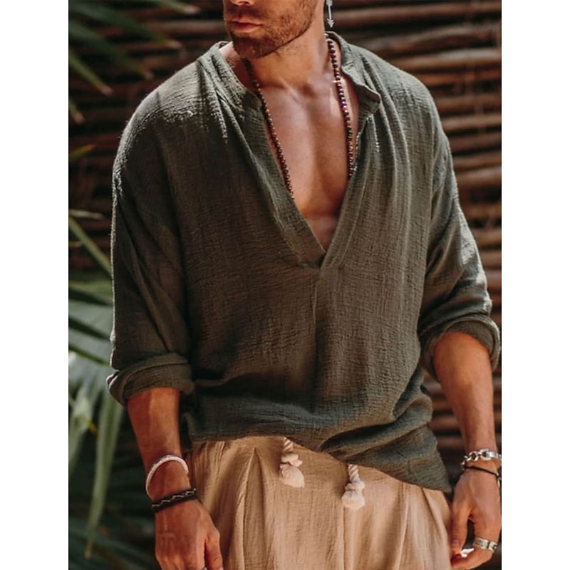 More information about Men's Shirt Linen Shirt Viking Style Summer Shirt Beach Wear Solid Color Outdoor Street Green Beige Long Sleeve V Neck Summer Spring Clothing Apparel