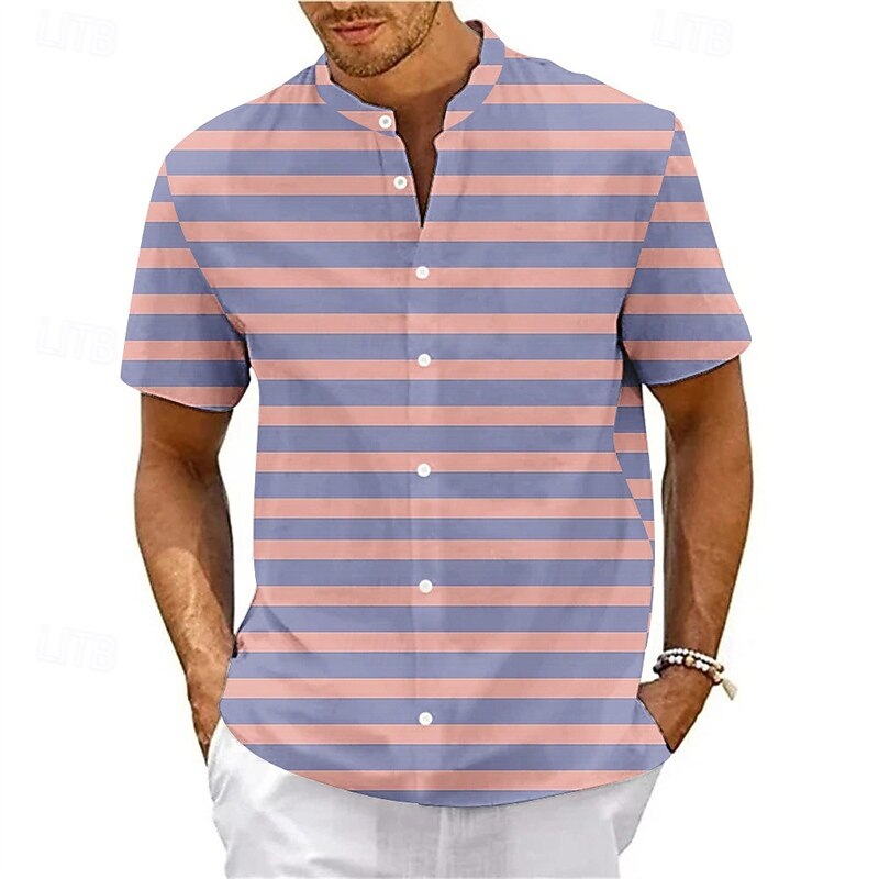 HOT ! Men's Shirt Summer Shirt Casual Shirt Beach Shirt Button Up Shirt Light Pink Black Pink Red Royal Blue Short Sleeve Stripes Band Collar Vacation Hawaiian Clothing Apparel Polyester Fashion Casual