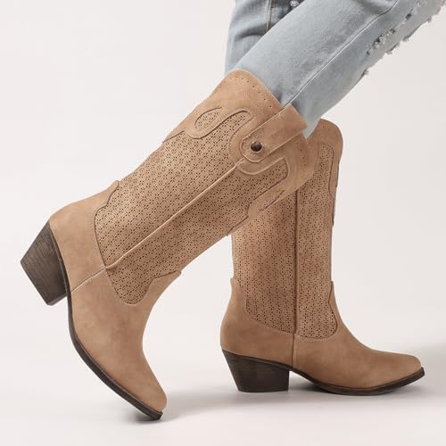Mid Calf Cowboy Boots for Women Chunky Block Heel Women’s Pointed Toe Casual Comfortable Boot Low Heel Trendy Stylish Boot 6