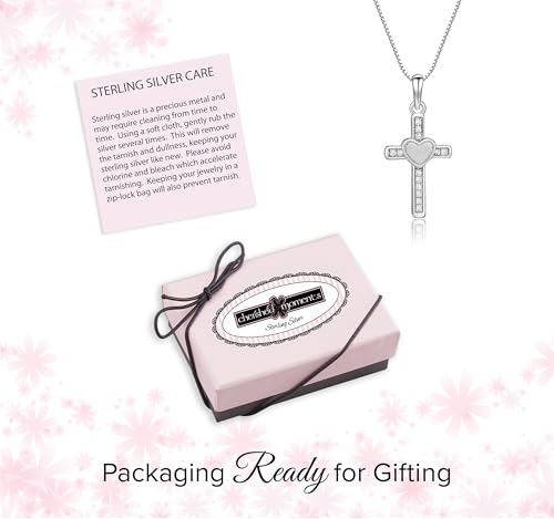 • PREMIUM QUALITY – Necklace is designed with .925 sterling silver and features a beautiful cross pendant with sparkling CZs accented with a heart in the center. This comes on a high-quality sterling silver (14 inch) chain with durable lobster clasp and makes a timeless keepsake she will treasure forever. Pendant dimensions 11.5mm x 18mm