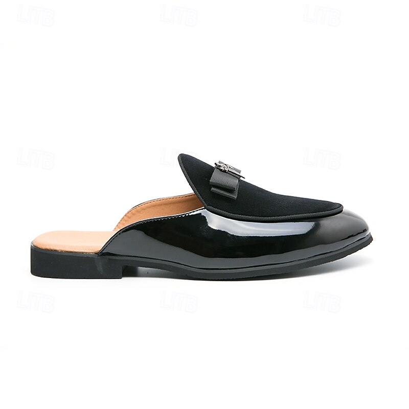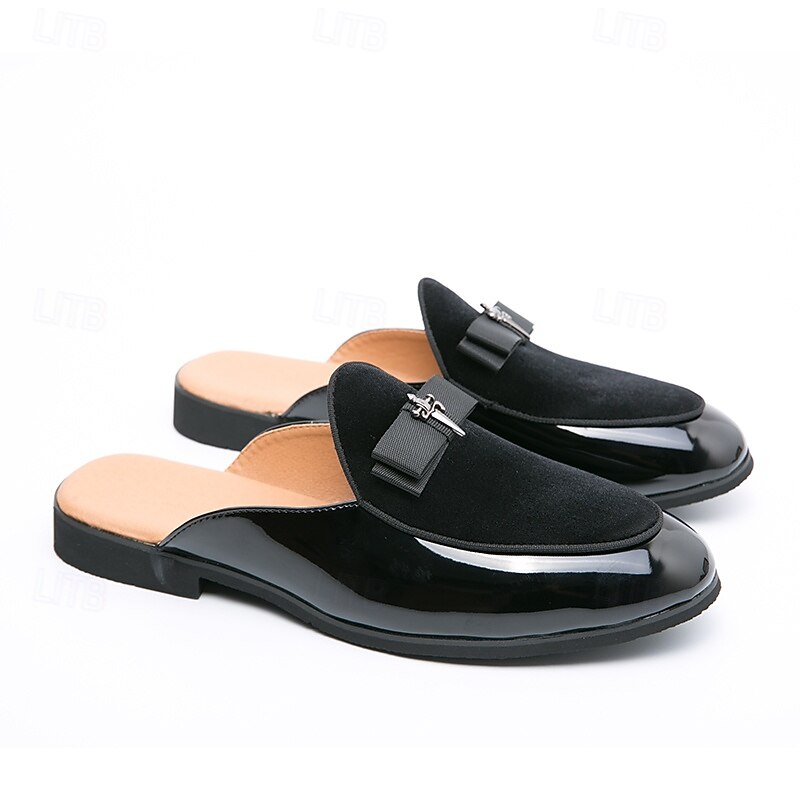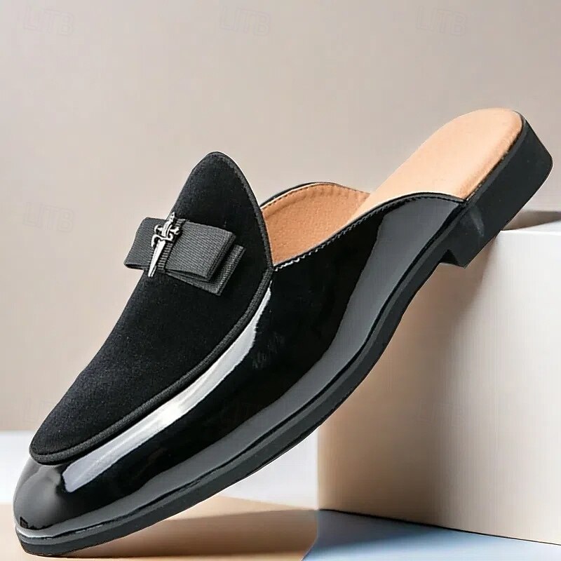 HOT ! Men's Velvet and Patent Leather Mule Loafers – Slip-On Design with Decorative Bow for Formal and Evening Events