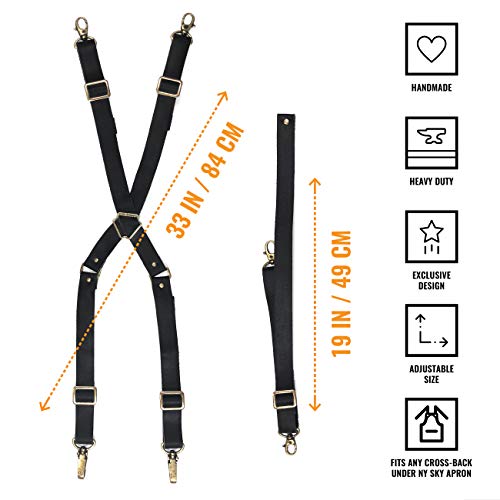 • HANDCRAFTED, REAL LEATHER, DURABLE QUALITY – This set is made of 100% Real Premium Leather – soft yet sturdy, staying like new for longer and guaranting you maximum comfort. Yet, clasp-and-ring system of anti-rust anti-allergy coated brass hardware, that fits any UNDER NY SKY Cross-Back apron, making you look good while providing extra support without having to deal with ties, knots or tangled straps.