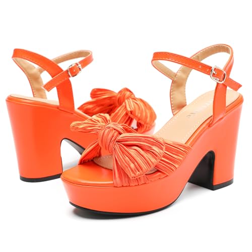 fereshte Women's Pleated Bow Knot Chunky Block Heels Platform High Heel Open Toe Ankle Strap Sandals 6