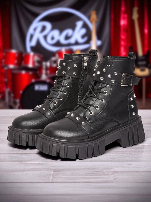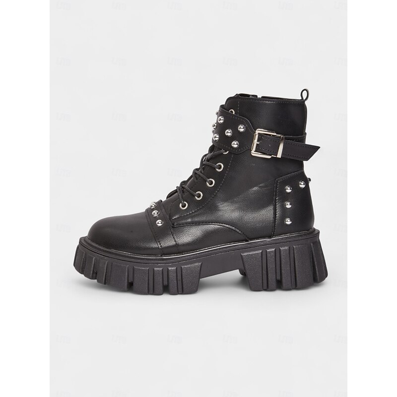 Women's Black Faux Leather Studded Biker Boots with Chunky Platform Sole, Side Zipper & Buckle Strap - Punk Style Ankle Boots for Teens and Women, Ideal for Concerts, Streetwear & Nightlife Outfits 1