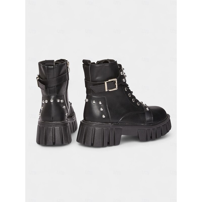Women's Black Faux Leather Studded Biker Boots with Chunky Platform Sole, Side Zipper & Buckle Strap - Punk Style Ankle Boots for Teens and Women, Ideal for Concerts, Streetwear & Nightlife Outfits 4