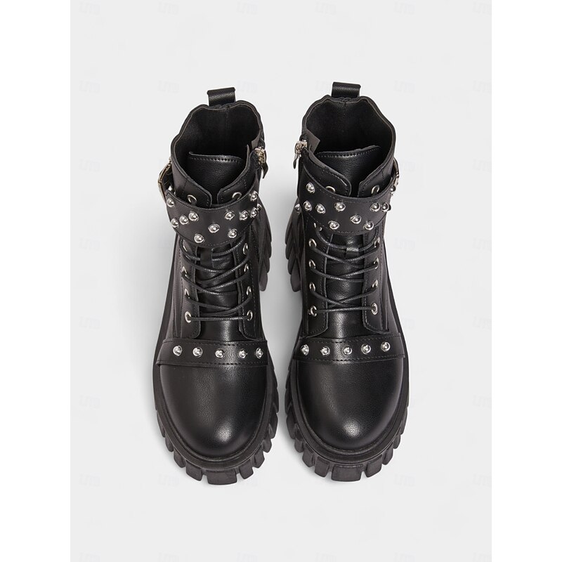 Women's Black Faux Leather Studded Biker Boots with Chunky Platform Sole, Side Zipper & Buckle Strap - Punk Style Ankle Boots for Teens and Women, Ideal for Concerts, Streetwear & Nightlife Outfits 10