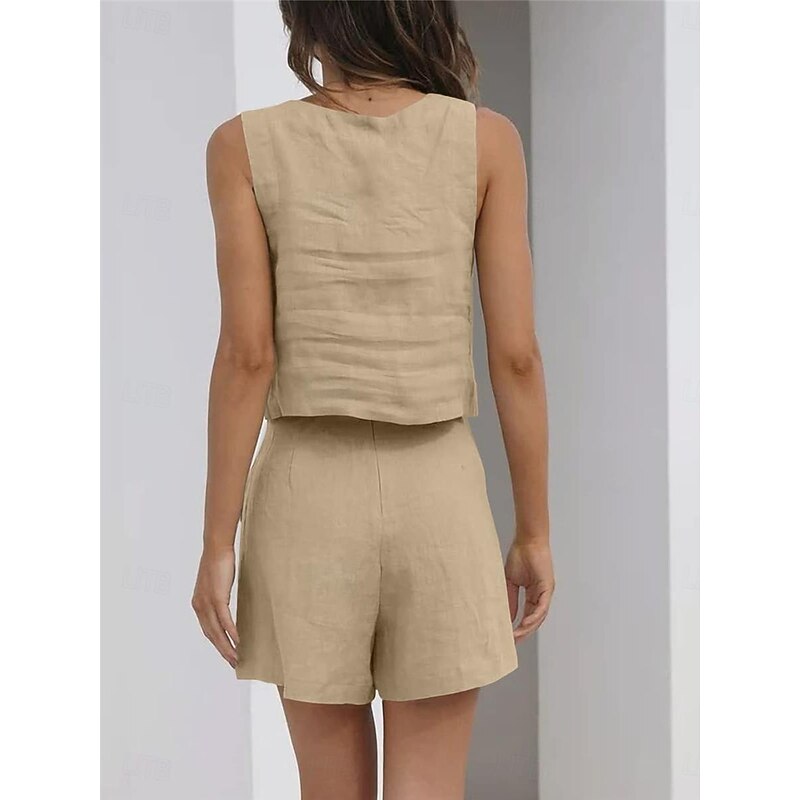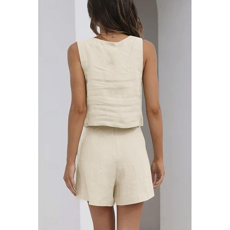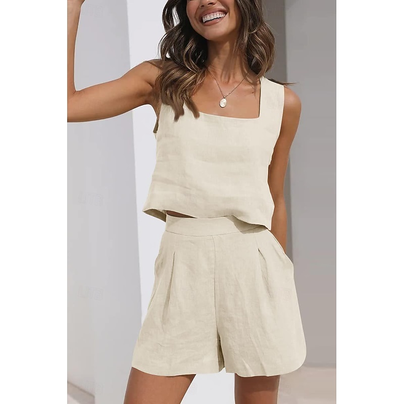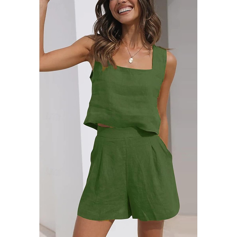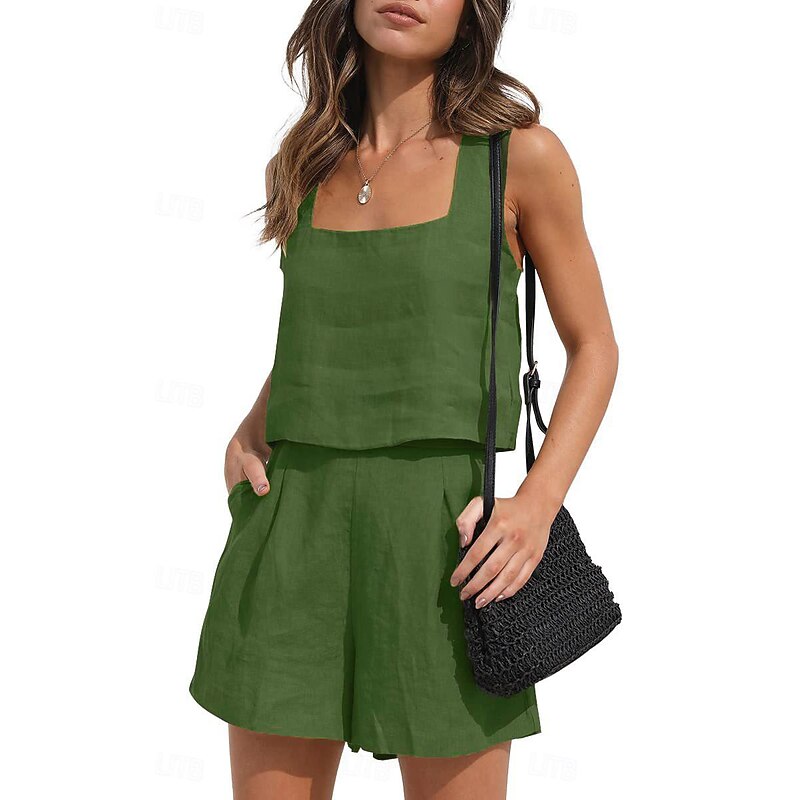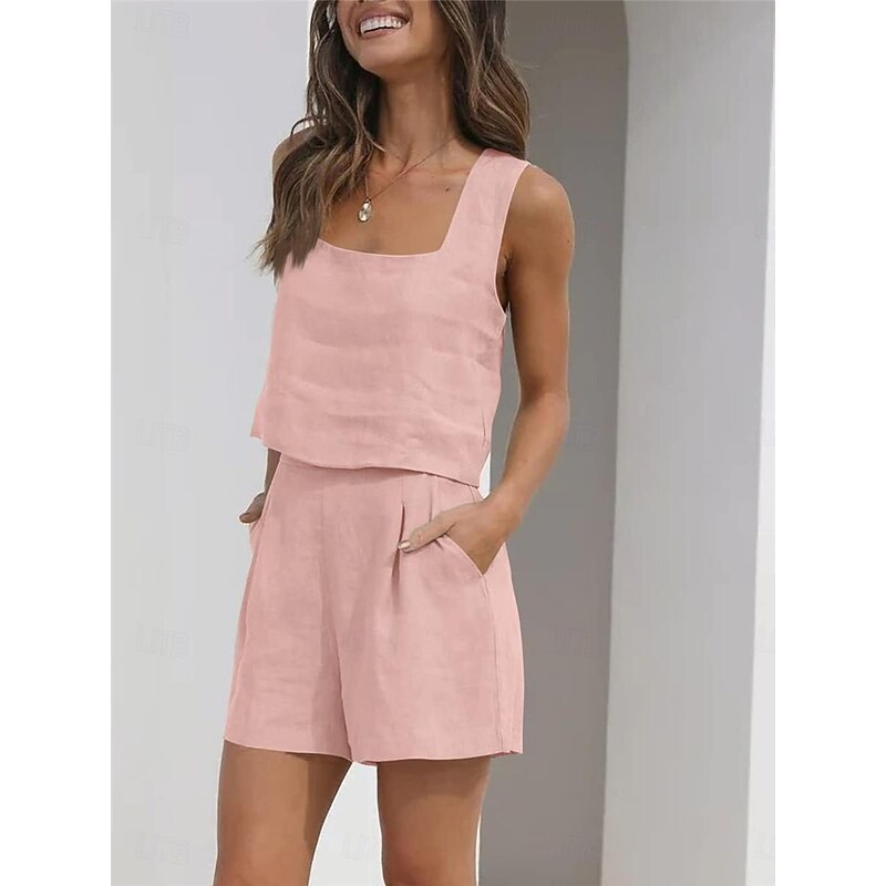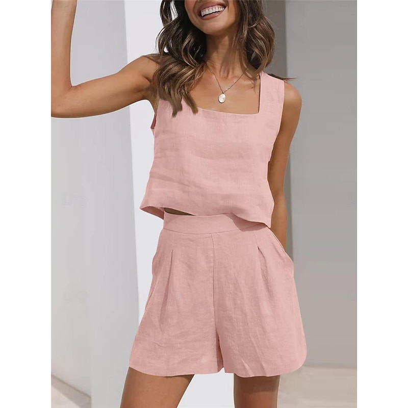 More information about Women's Loungewear Sets Pure Color Fashion Basic Street Daily Cotton And Linen Breathable Square Neck Sleeveless Strap Top Shorts Pocket Summer Spring Black Pink