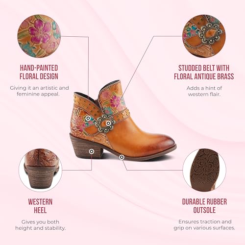 • Leather Western-style booties, Embossed handpainted flowers on the collar and heel, Studded belt with floral antique brass embellishment , Dip in the topline for a flirty appearance, Western heel.
