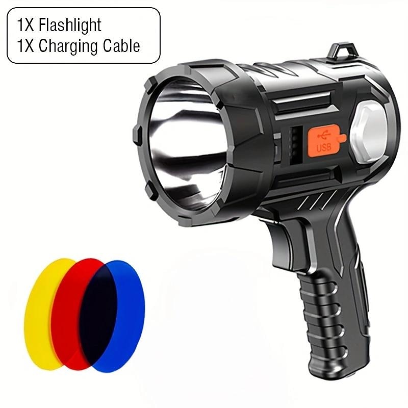 HOT ! 1pc Portable Searchlight, Strong Flash Light, Powerful LED Home Torch, Waterproof Fishing Outdoor Lantern, USB Rechargeable Spotlight With Red Blue Yellow 3 Color Lens Filter