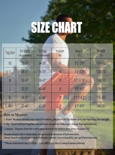 • Regular fitting: 9 inch inseam for all sizes, please compare shorts size chart (last picture) with yours before ordering. (For reference: model 6.1 ft/170 lbs wears M )