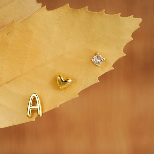 • DAINTY STUD EARRINGS SET: Turandoss 3-piece gold earrings set includes an initial stud, heart stud, and cubic zirconia stud – ideal as dainty stud earrings for lobe, cartilage, tragus, helix, and second/third holes. Great as stackable earrings to create trendy ear layering looks. This initial heart zircon earrings set works with casual, minimalist, or trendy looks. Use as single or stackable earrings to elevate your outfit, whether for everyday wear, work, or special occasions.