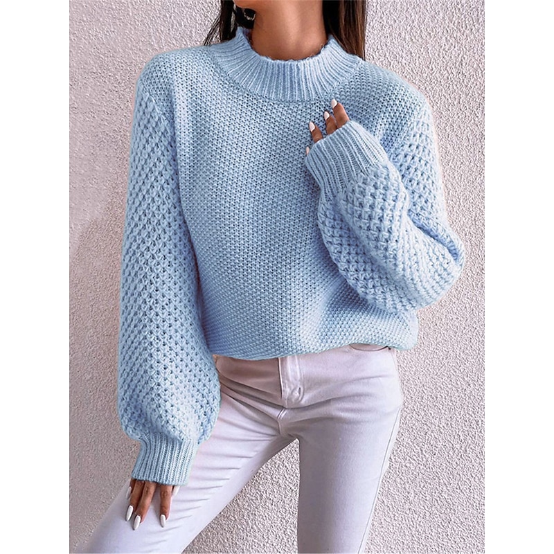 This stylish sweater showcases a distinctive ribbed knit pattern, offering a touch of texture and structure. The sleeves are long and slightly ballooned, while the cuffs, neckline, and hem feature a ribbed texture, ensuring a snug and polished finish. Available in pure colors like blue, white, and pink, this piece exudes femininity and elegance.