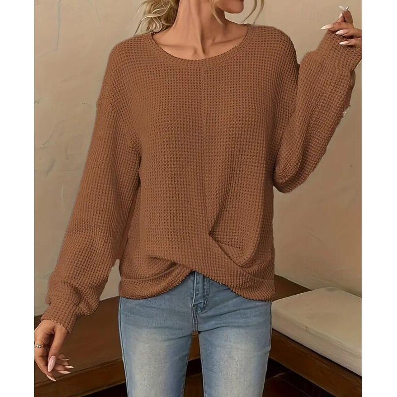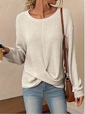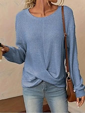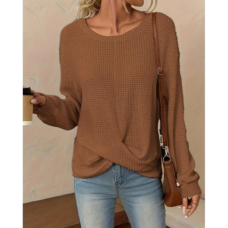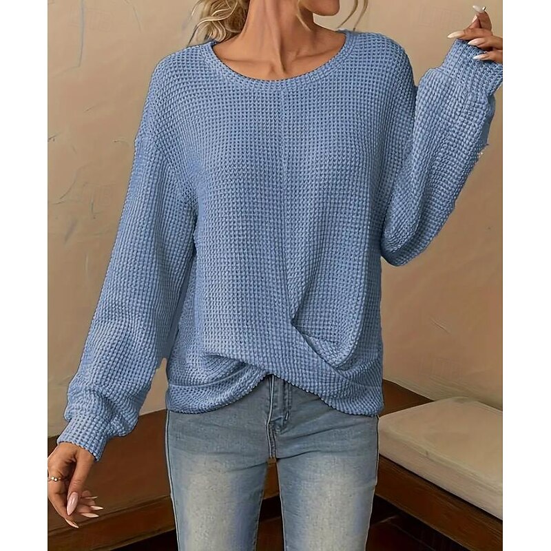 Highlights [Fabric & Fit] : Crafted from a soft polyester blend, this tunic offers a relaxed fit with micro-elasticity for added comfort. The subtly textured waffle knit pattern enhances its cozy appeal, making it a great choice for both spring and fall. [Design Highlights] : Featuring a classic crew neckline and long sleeves, this tunic also boasts an asymmetrical design with a slightly twisted front hemline, adding a modern touch and flattering silhouette to your outfit. [Occasions] : This versatile piece is perfect for daily wear, whether you’re heading to a casual lunch or simply enjoying a leisurely day out. Its elegant, laid-back style makes it easy to pair with jeans or skirts for a variety of occasions. [Size Range] : Available in a range of sizes from S to 2XL, this tunic ensures a loose, comfortable fit, catering to different body types and style preferences. The neutral color options of blue, white, and khaki contribute to its versatility. [Care Instructions] : Designed for ease, this tunic can be machine washed, promising convenience while maintaining quality and longevity.