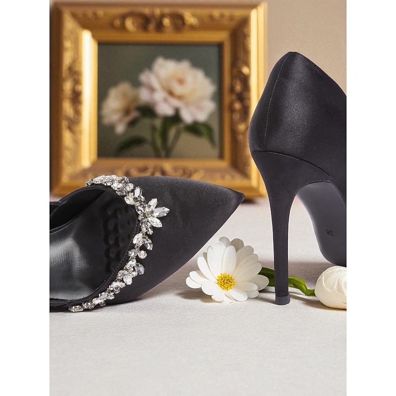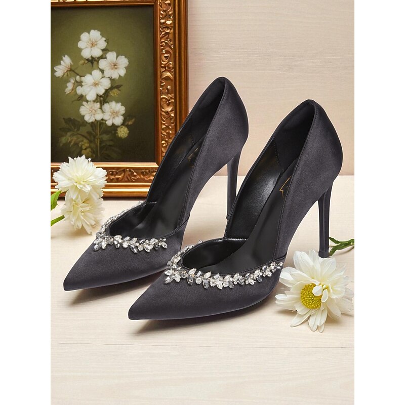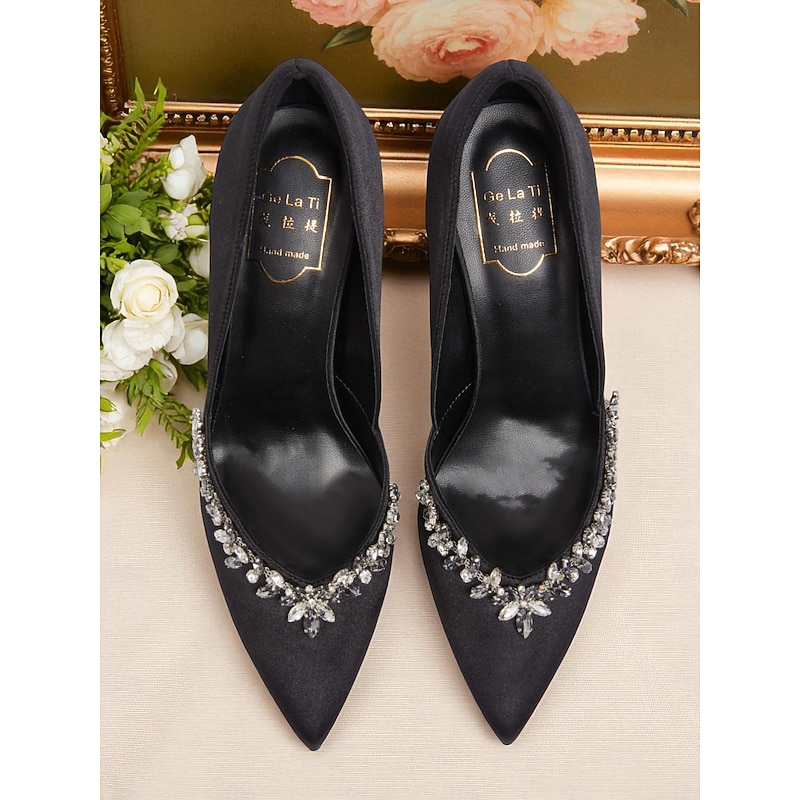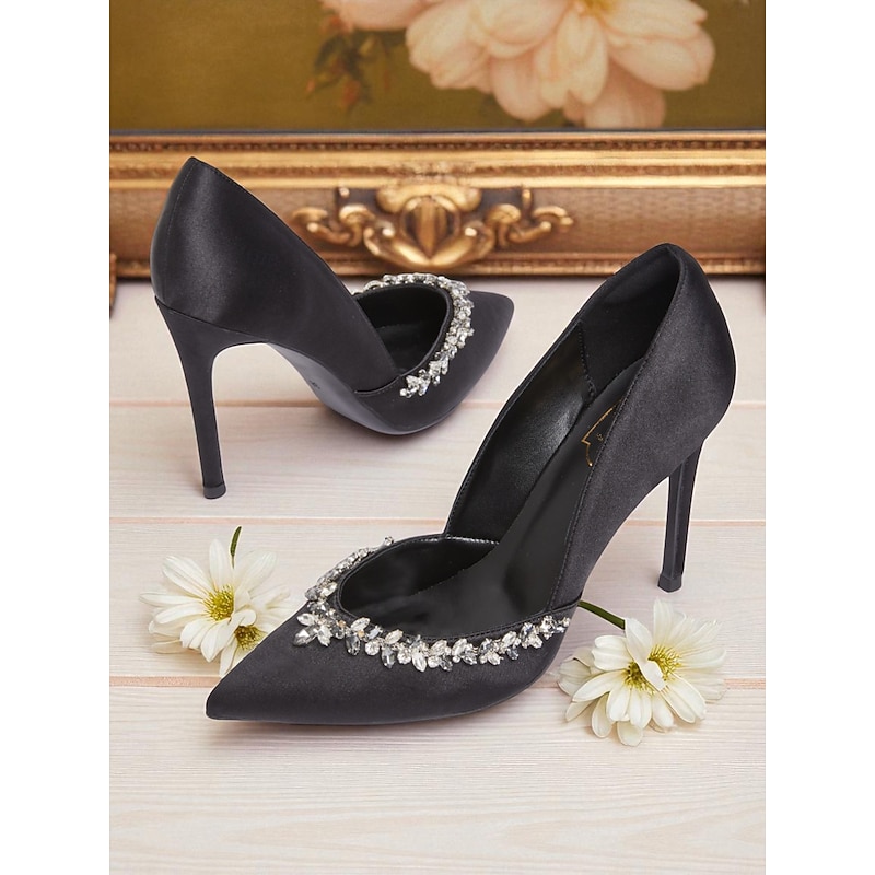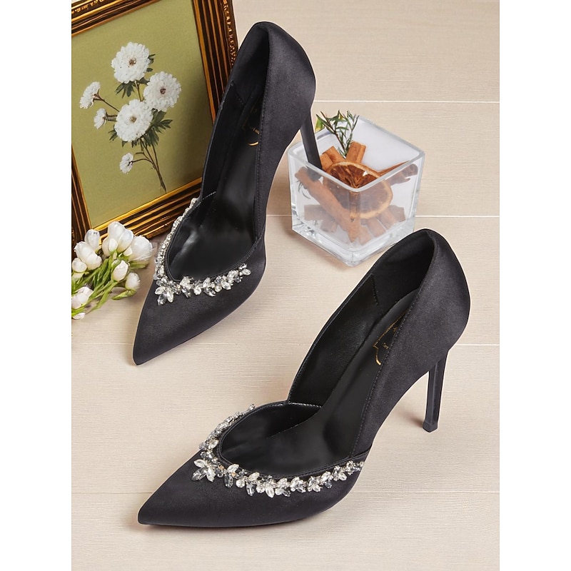 Women's Satin Pointed Toe Heels with Crystal Embellishment, Elegant Cocktail Party Shoes for Special Occasions 1