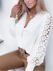 Highlights [Fabric] : Crafted from a soft blend of polyester, this blouse ensures comfort and breathability, ideal for the transitional seasons of spring and fall. The micro-elastic fabric offers a gentle stretch for easy movement throughout the day. [Fit] : Designed with a slimming form fit, this blouse enhances the natural silhouette, providing a flattering and modern look that complements a variety of body types. The regular top length ensures a stylish fit suitable for daily wear. [Design Highlights] : Featuring intricate lace detailing along the V-neckline and sleeves, the blouse adopts a sophisticated approach to modern fashion. The solid white color offers a versatile base, while the lace and patchwork elements add an elegant touch. [Occasions] : Perfect for daily wear and work settings, this blouse is suited for both casual and formal occasions. Whether you're heading to the office or enjoying a day out, its stylish and modern design ensures you remain comfortably elegant. [Size Range] : Available in a variety of sizes, including S, M, L, XL, and 2XL, providing options for different body types and preferences.