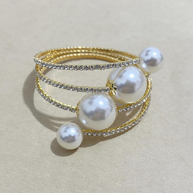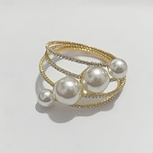 Highlights [Fabric] : Crafted from high-quality alloy, this women's cuff bracelet showcases a luxurious yet durable design, ensuring a timeless addition to your jewelry collection. [Shape] : The bracelet features a beautifully round silhouette that enhances its graceful appearance, expertly combining elegance with a modern touch for versatile styling. [Design Highlights] : Adorned with intertwined silver bands and shimmering rhinestones, this bracelet is accentuated by three refined faux pearls of varying sizes, creating an eye-catching interplay of sparkle and sophistication. The open-cuff design allows for effortless adjustment, ensuring a perfect fit on any wrist. [Occasions] : Ideal for parties, evening events, dates, and birthdays, this exquisite piece elevates your look, adding a touch of refined elegance suitable for formal and casual settings alike. [Size Range] : Designed to fit various wrist sizes comfortably, the adjustable open-cuff design provides easy adaptability, allowing for a personalized fit without compromising style.