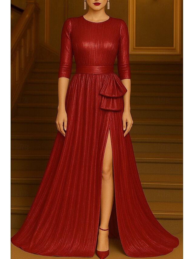 More information about Gold Black A-Line Evening Gown Elegant Formal Dress Formal Wedding Floor Length 3/4 Length Sleeve Crew Neck Lurex Fabric with Glitter Pleats 2025