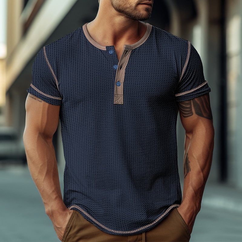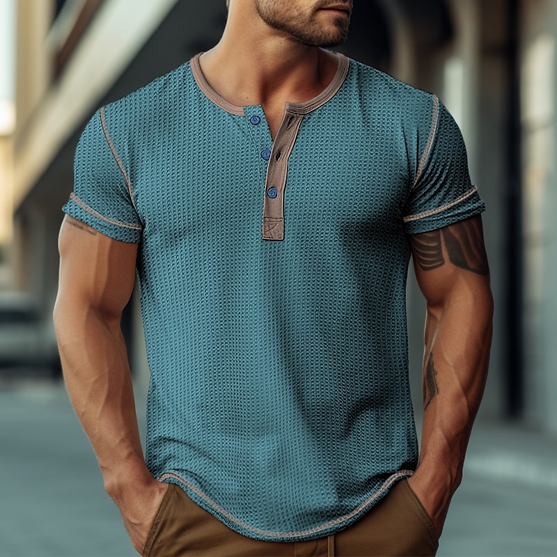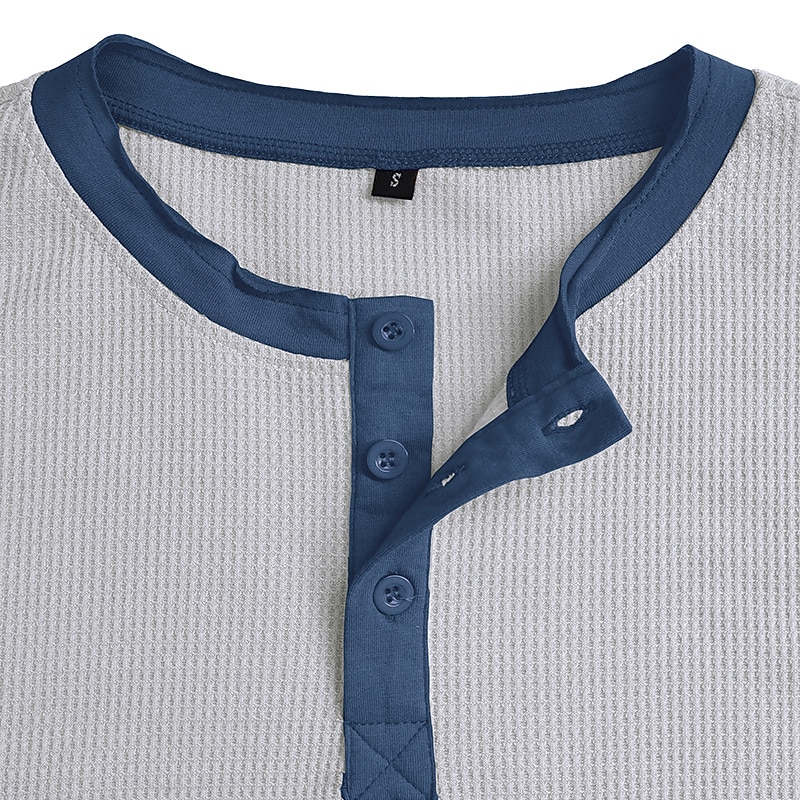 Highlights [Fabric] : Crafted from a breathable polyester blend, this men's Henley shirt features a textured waffle knit pattern that enhances both style and ventilation, making it perfect for summer wear. The shirt is designed to be comfortable yet stylish, allowing for a micro-elastic fit that gently conforms to the body without being restrictive. [Fit] : The shirt offers a regular fit that is both relaxed and flattering, ensuring comfort while maintaining a tailored appearance. It's ideal for those who prefer a shirt that complements their physique without feeling too tight. [Design Highlights] : Showcasing a classic Henley neckline with a three-button placket, this shirt combines a casual aesthetic with a modern twist. The color block pattern with contrasting blue accents on the sleeves and bottom hem adds a touch of sophistication, while the patchwork design further enhances its visual appeal. [Occasions] : This versatile Henley shirt is perfect for various occasions including casual daily wear, vacations, street style outings, and semi-casual gatherings. Its relaxed yet fashionable design makes it suitable for both laid-back afternoons and evening outings. [Size Range] : Available in a wide range of sizes from S to XXXL, ensuring an ideal fit for a variety of body types. This range allows for a comfortable and flattering fit for adults looking for reliable summer apparel.