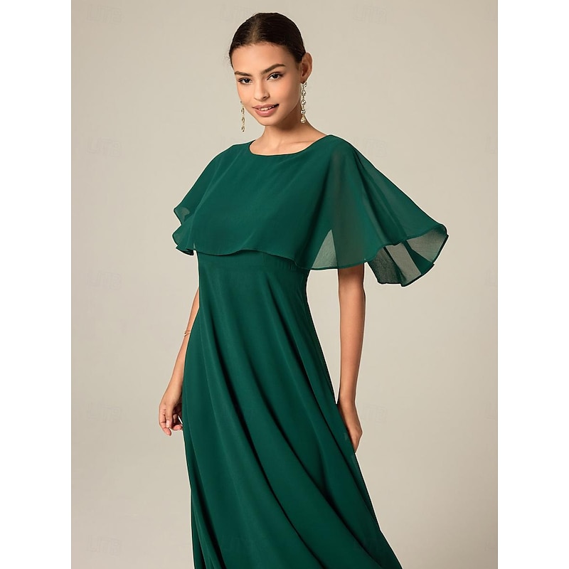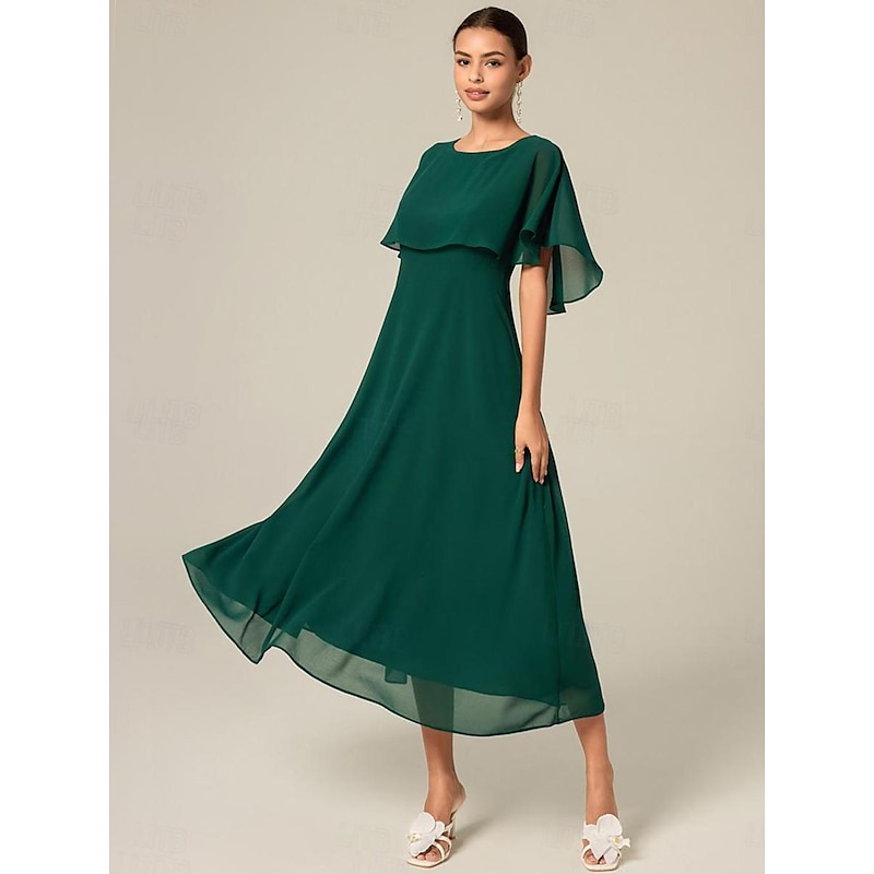 Highlights [Fabric] : Crafted from lightweight chiffon, this women's dress offers a breathable and elegant feel, perfect for warm summer days. The chiffon fabric ensures a delicate and floaty silhouette, enhancing the dress's sophisticated appeal. [Silhouette] : The dress boasts an A-line cut that is universally flattering, providing a regular fit that comfortably suits a variety of body types. Its midi-length hemline adds a touch of elegance, making it versatile for both day and evening wear. [Design Highlights] : Featuring a crew neck and flared short sleeves, this dress incorporates a ruffle detail design that adds a feminine touch. The shoulder overlay drapes gracefully, creating an ethereal cape effect for a unique and chic look. [Occasions] : Ideal for formal and semi-formal events such as weddings, parties, and cocktail gatherings, this elegant dress allows you to make a stylish statement at any special event. [Size Range] : Available in a wide range of sizes from S to XXL, ensuring a suitable fit for different body shapes and preferences.