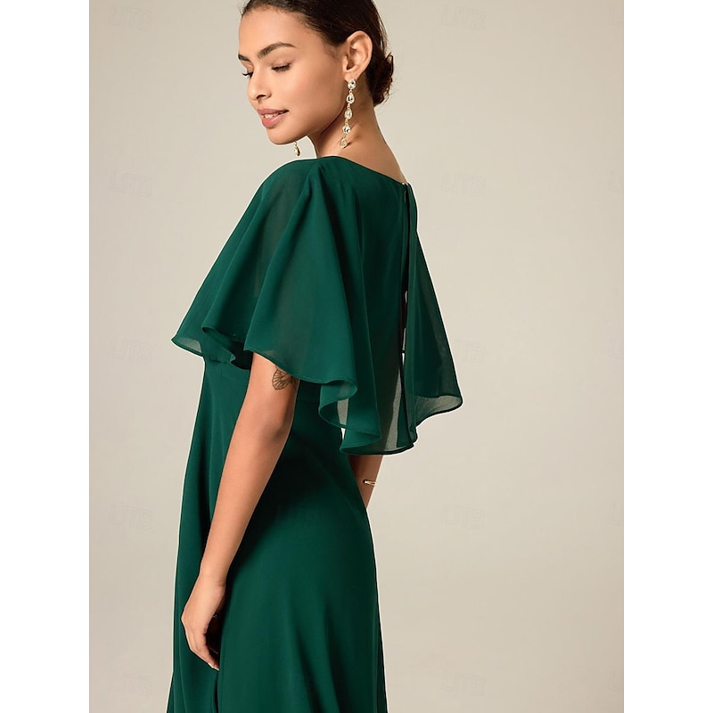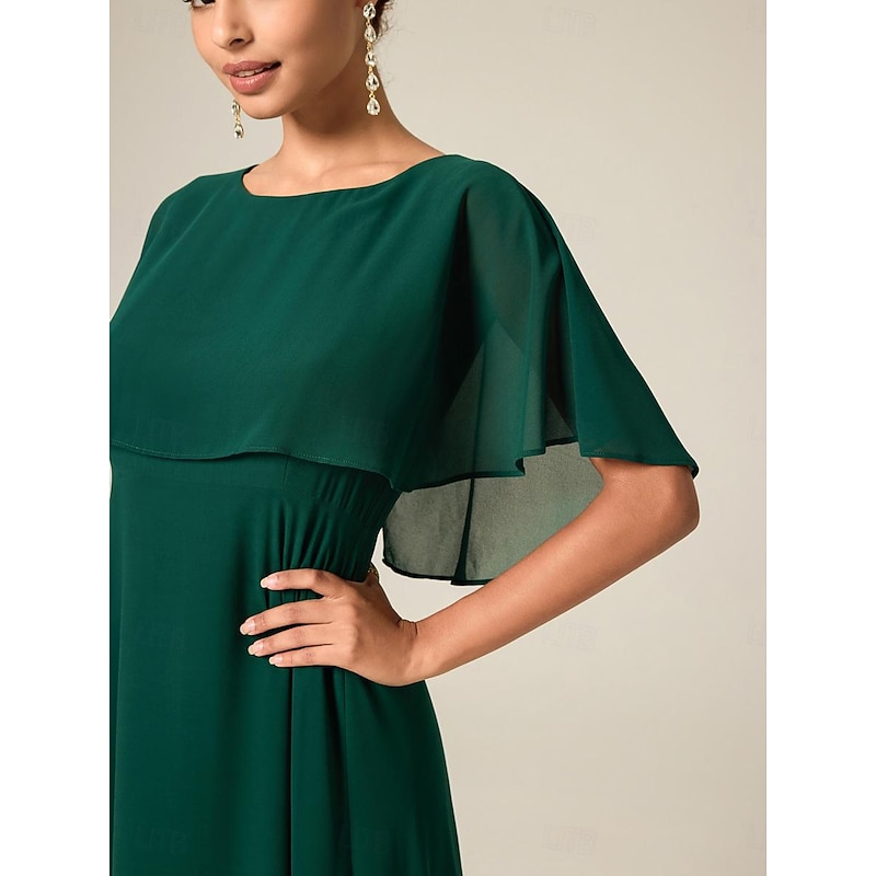 More information about Women's Wedding Guest Cocktail Dress Chiffon Ruffle Elegant Formal Midi A Line Dress Crew Neck Short Sleeve Flared Sleeve Dark Green Color