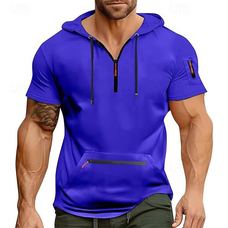 Highlights - Stay cool and stylish in the summer heat with this polyester short sleeve hoodie for men - Features a trendy quarter zip design for versatility and easy wear - Perfect for casual outings or workouts, this hoodie has a hooded neckline for added comfort - Elevate your summer wardrobe with this must-have piece