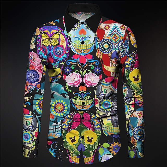 Men's Skull Geometric Pattern Shirt Button Up Shirt Long Sleeve Abstract Gothic Carnival Daily Wear Going out Fall & Winter Turndown Print Button-Down Red Blue Purple Green Light Grey 9