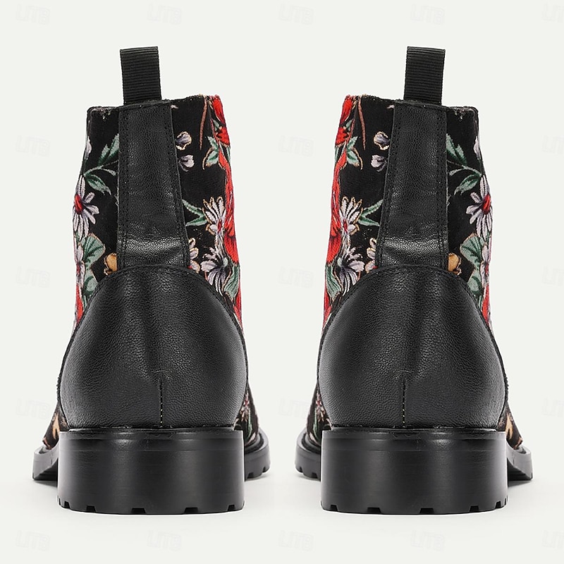 Men's Black Floral Combat Boots with Rugged Soles and Leather Toe Caps for Casual and Outdoor Wear 1